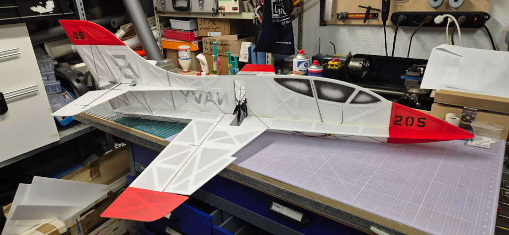 Heute ist er endlich fertig geworden. Der Erstflug findet dann nächsten Sonntag in der Halle statt. In der kommenden Woche werde ich noch ein paar SMD LEDs zur Beleuchtung anbringen.
