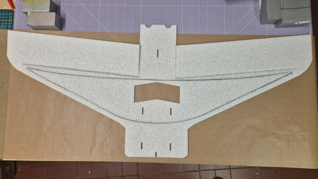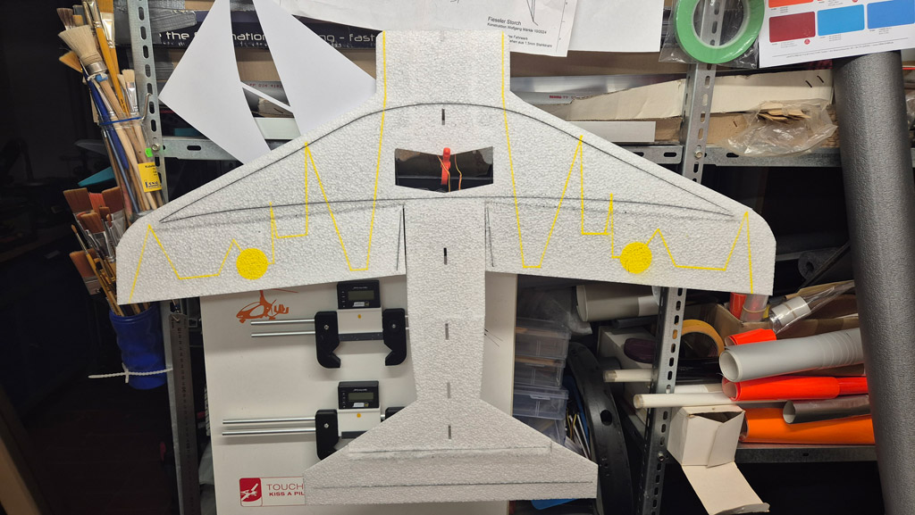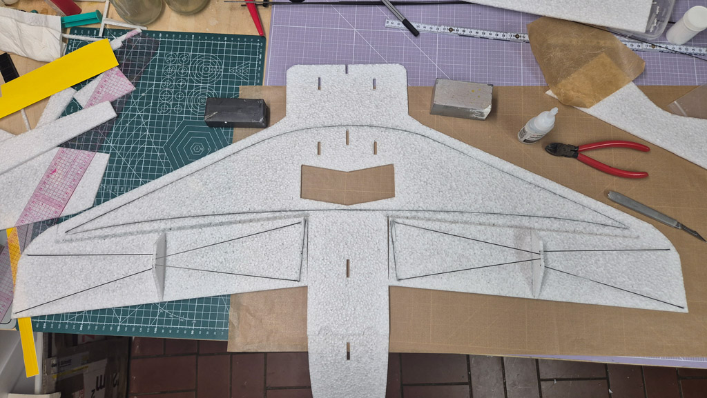 Weiterhin habe ich am Höhenruder den V-Ausschnitt noch nicht gemacht, um mehr Ruderfläche zu haben. Ich denke das lasse ich auch so. Das Seitenruder jedoch werde ich demnächst noch etwas verkleinern, so groß wie im Plan braucht es dann doch nicht zu sein.