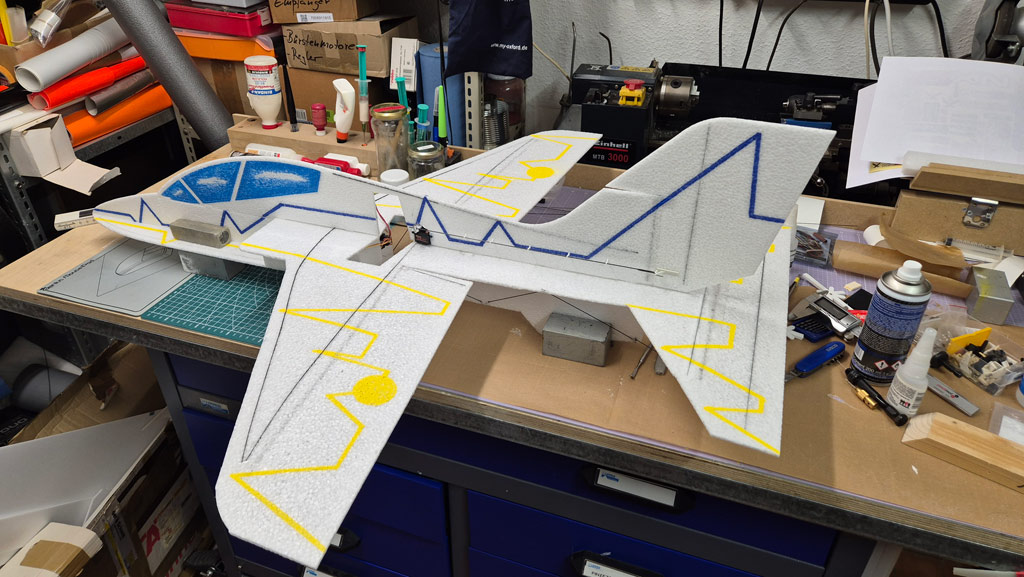 - Die T-45 ist normalerweise ein Tiefdecker. Um die Agilität zu erhöhen, habe ich die Tragfächen angehoben und genau in der Propellerachse positioniert. D.h. mein Flieger ist jetzt ein Mitteldecker. Mal schauen, ob das so hinhaut.