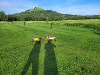 Der Motor wurde wie im Bauplan vorgesehen VOR den Kopfspant gesetzt. Dadurch sind Kühlprobleme, die ich anfangs mit meinem BT hatte, passé. Die Ruderanlenkungen und die Tragflächenstreben wurden dieses mal ebenfalls wie im Bauplan angegeben aus Schaschlikspießen und nicht aus Carbon gemacht. Dadurch kann man sie viel leichter mit Acrylfarbe airbrushen oder anstreichen und somit dem Modell anpassen. Auch hier verlief der Erstlug perfekt. Nur 2 Klicks musste das HR nachgetrimmt werden.