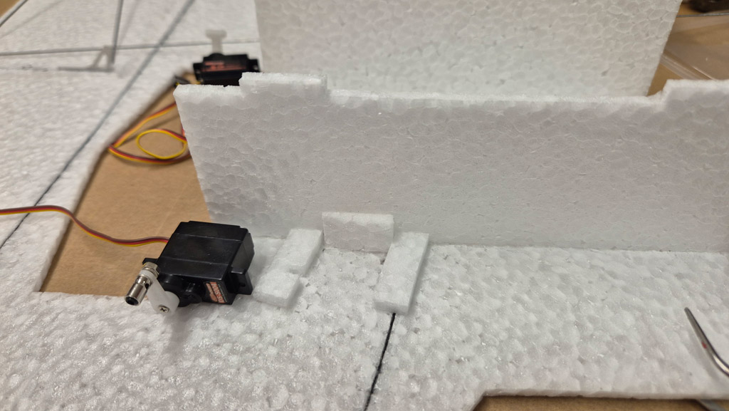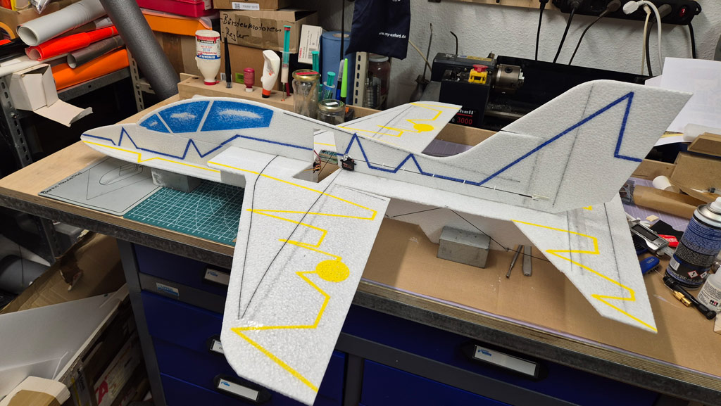 - Die T-45 ist normalerweise ein Tiefdecker. Um die Agilität zu erhöhen, habe ich die Tragfächen angehoben und genau in der Propellerachse positioniert. D.h. mein Flieger ist jetzt ein Mitteldecker. Mal schauen, ob das so hinhaut.