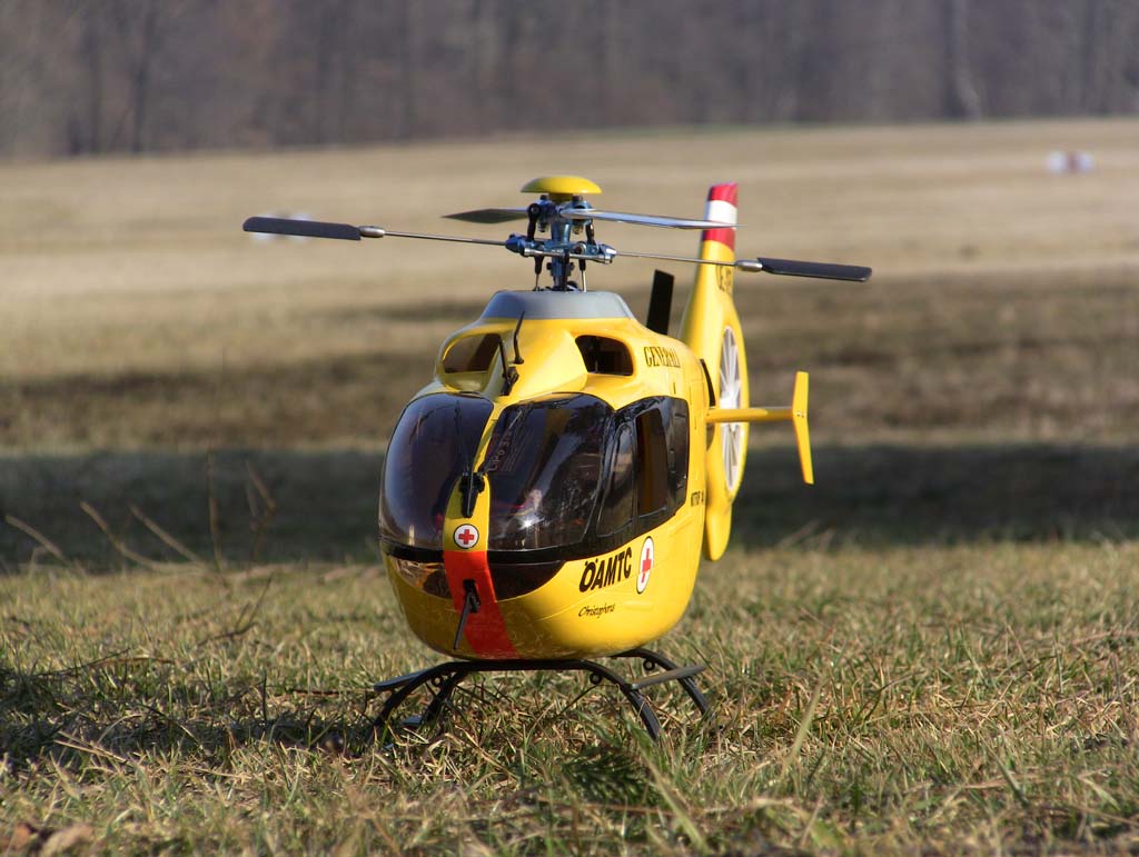 Leider hatte sich die EC-135 Nr. 1 bei einem der weiteren Flüge in Hayingen durch extreme Vibrationen selbst zerlegt. Deshalb habe ich mir einen neuen T-Rex 450 Sport V2 und einen neuen Rumpf gekauft. Einige Optimierungen, um die Vibrationen zu beseitigen, wurden gemacht und das ist das Ergebnis.