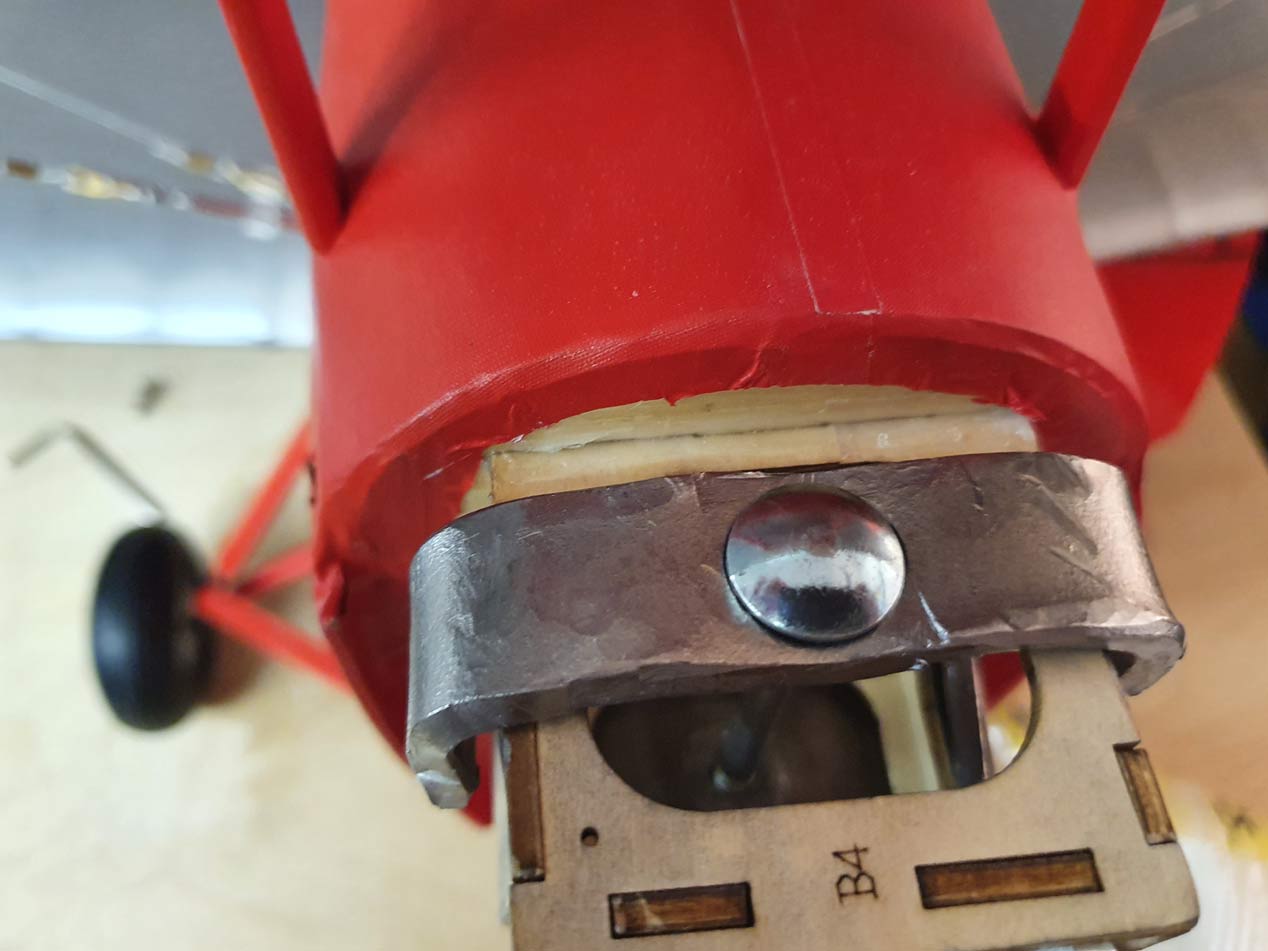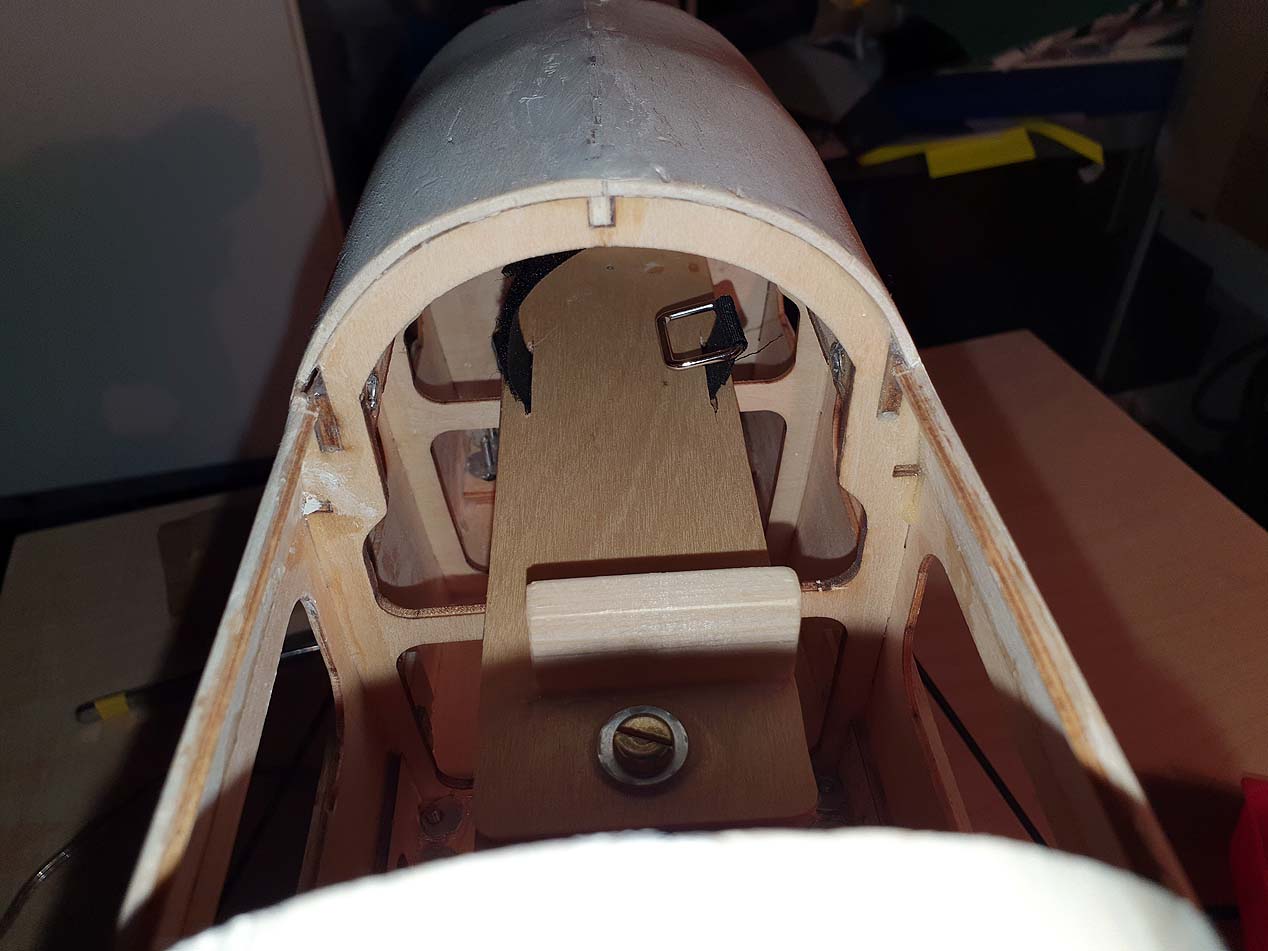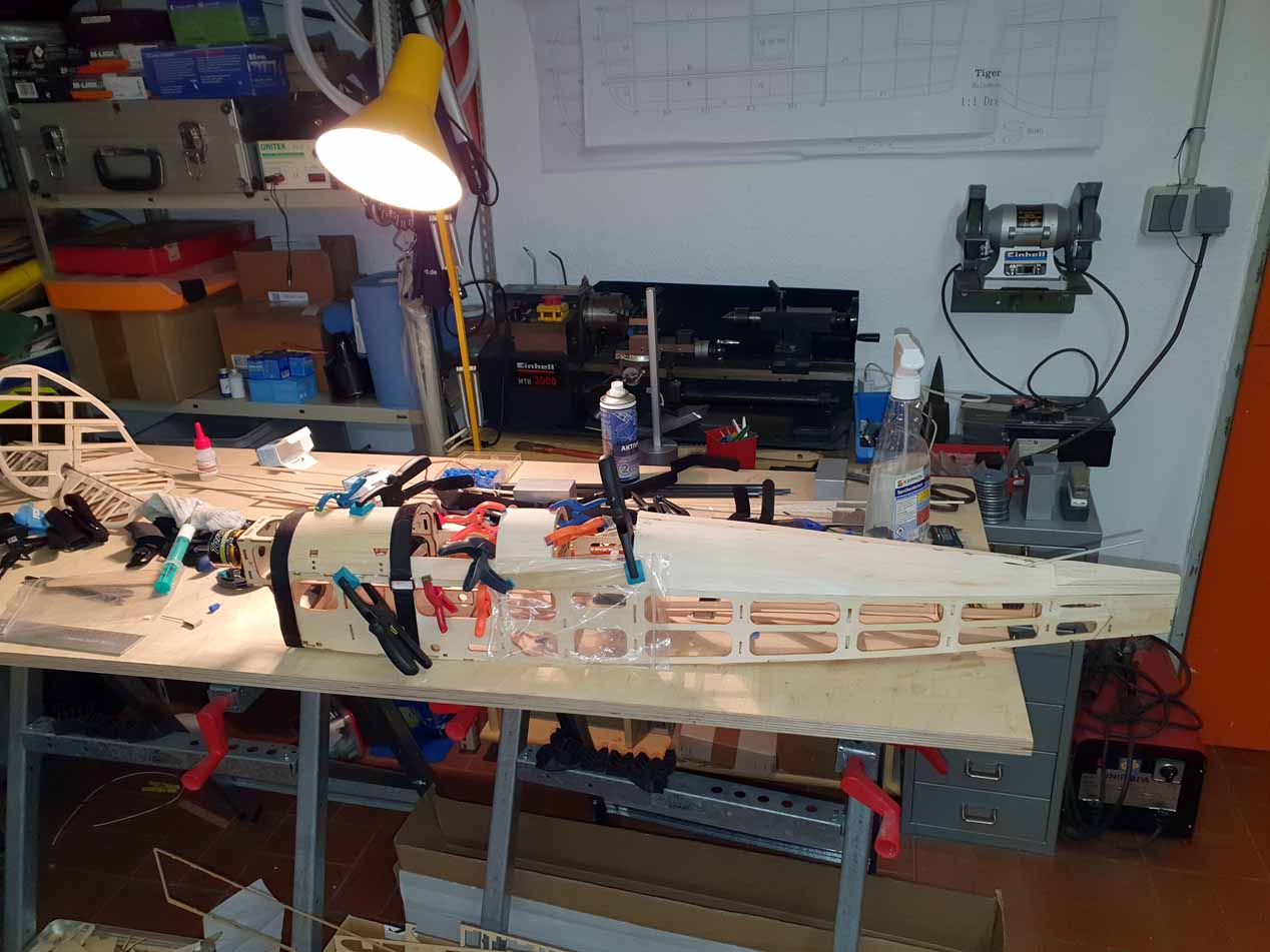 - Ebenso am Rumpf wurde ein Balsastreifen zur zusätzlichen Profilierung angebracht, um den Rohr-Tuch-Aufbau der Tiger Moth zu simulieren.