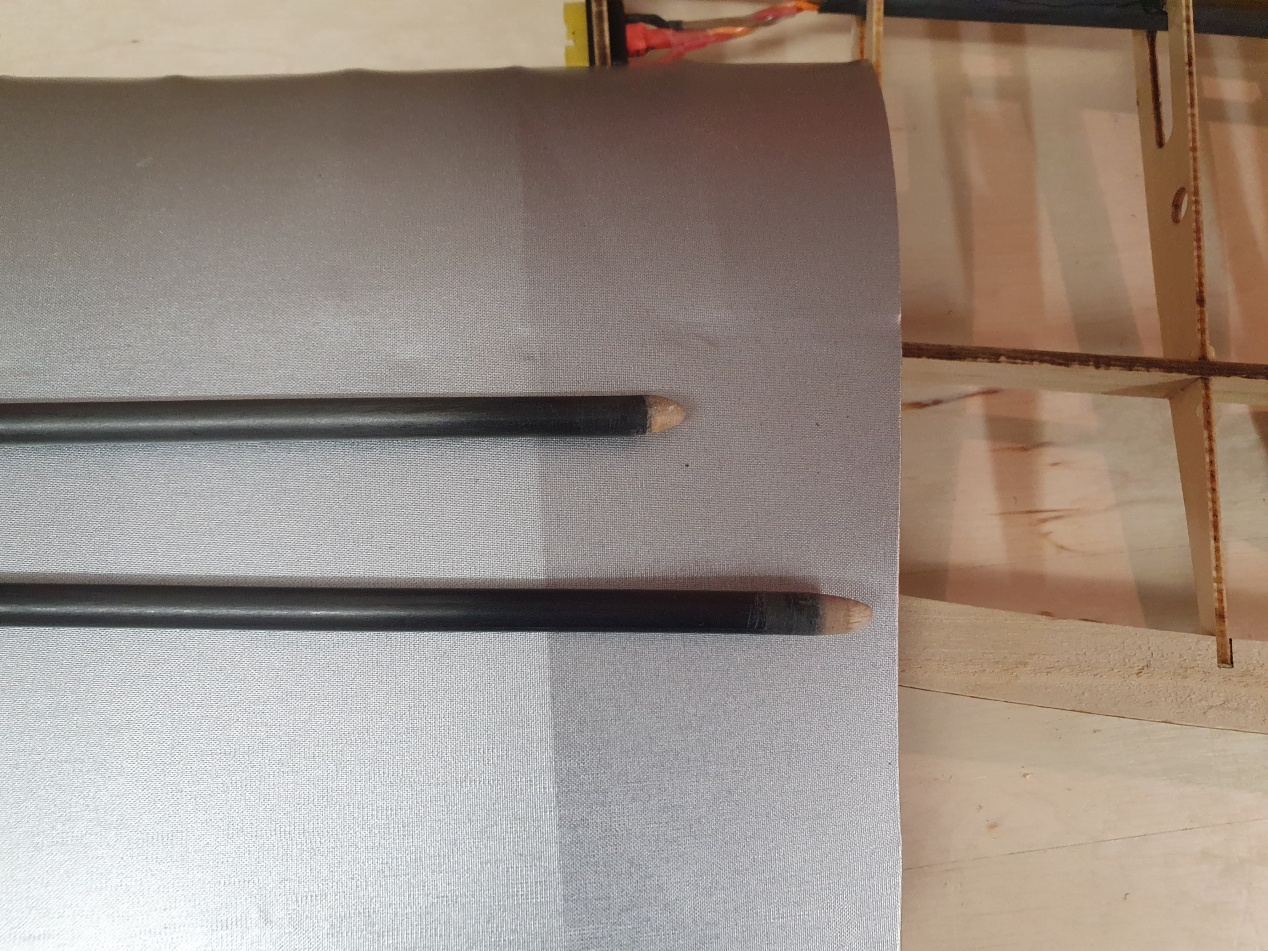 - Die Tragflächen weisen einen nicht unerheblichen Verzug auf, wodurch die Tiger Moth einen starken Rechtszug hat. Ich bin gerade dabei die Folie nochmals nachzuspannen, was aber nicht ganz ausreicht. ich muss die Verspannung nochmals in der Länge korrigieren, um den Verzug der Tragfäcken auszugleichen.