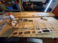 - Als erstes habe ich eine GfK Verstärkung am Höhenruder angebracht, um die beiden HR Hälften stabiler miteinander zu verbinden. Die Balsaholzendleiste des HR ist etwas zu schwach. Bei einem Neubau würde ich hier einfach ein CfK Röhrchen in der Endleiste plazieren.